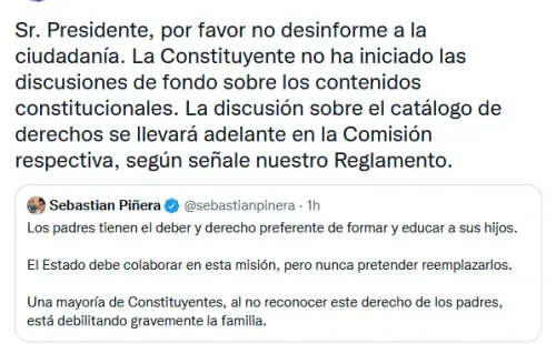 “Sr. Presidente, por favor no desinforme a la ciudadanía. La Constituyente no ha iniciado las discusiones de fondo sobre los contenidos constitucionales. La discusión sobre el catálogo de derechos se llevará adelante en la Comisión respectiva, según señale nuestro Reglamento”, puntualizó Bassa.