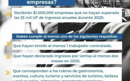Cada vez falta menos para que inicie el proceso de solicitud del Bono Alivio para Pymes, el beneficio recientemente aprobado por el Poder Legislativo que busca ir en auxilio de los giros comerciales más golpeado a propósito dela pandemia del coronavirus y que sus dueños sean pequeños y medianosempresarios. Sin embargo, esta gratificación, que asciende hasta el millón de pesos, incluye también a feriantes, cuyo único requisito será contar con permiso municipal para ejercer aquel oficio.