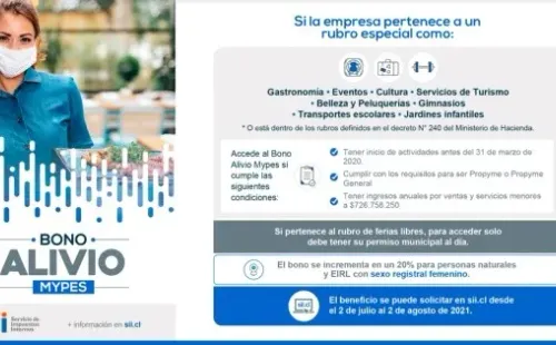 Para saber si eres beneficiario del Bono Alivio, debes ingresar al sitio web del Servicio de Impuestos Internos www.sii.cl, acceder al banner “Beneficios MYPES” y “Bono Alivio Mypes”; posteriormente dale clic en “Ssolicitar y Consultar Bono Alivio Mypes”.