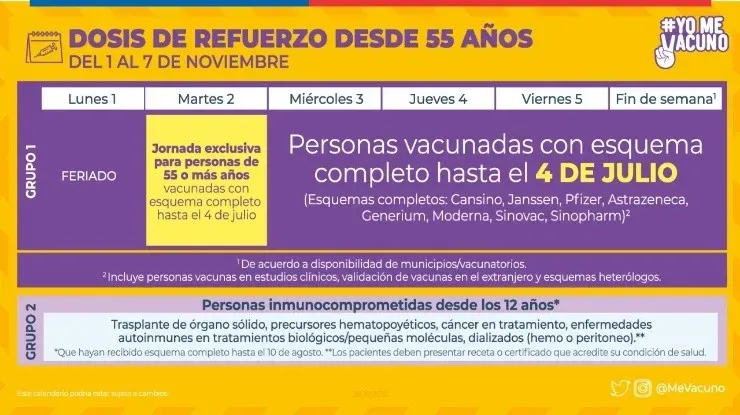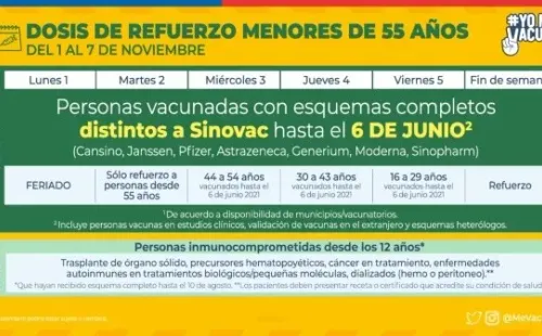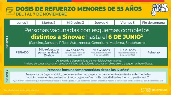 5.960.600 personas se han inoculado con la dosis de refuerzo de la vacuna anticovid, destacándose la vacunación de 1,5 millones de ciudadanos solo en la semana del 25 al 31 de octubre, luego de anunciarse la exigencia de la vacuna de refuerzo para que mayores de 55 años mantengan el pase de movilidad.