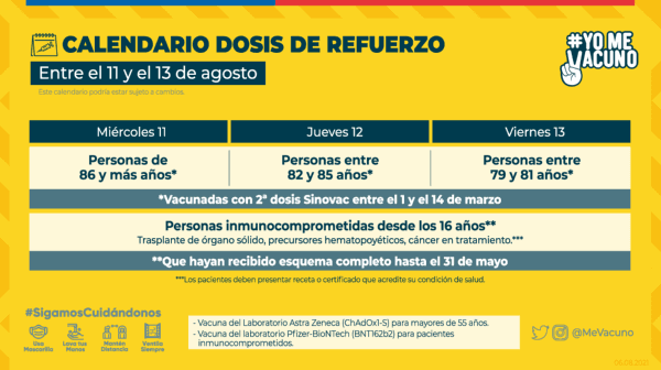 La dosis de refuerzo está pensada en personas que fueron inoculadas con Sinovac y personas inmunocomprometidas. Las primeras recibirán la vacuna AstraZeneca y las segundas la vacuna Pfizer.