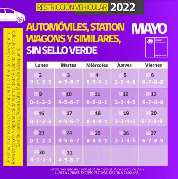 El Ministerio de Tranportes aún no publica el calendario del mes de junio, pero si te dejamos los días que restan del mes de mayo.