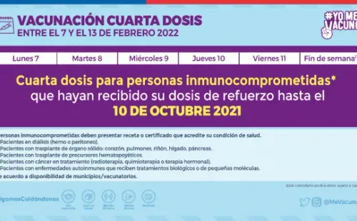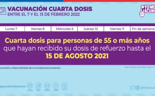 Esta semana, sigue el calendario de vacunación para lapoblación mayor de 55 años que hayan recibido su última vacuna hasta el 15 de agosto de 2021. Les corresponde esta semana su cuarta dosis (Segunda dosis de refuerzo).