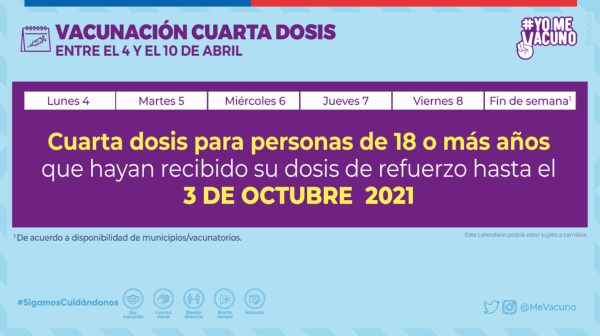 Bajo el mismo contexto,las autoridades sanitarias publicaron las nuevas jornadas de inmunizacióny la próxima semana continúalavacunación de lacuarta dosis en personas desde los 18o másañosque hayan recibido la tercera dosis hasta el 3 de octubre de 2021.