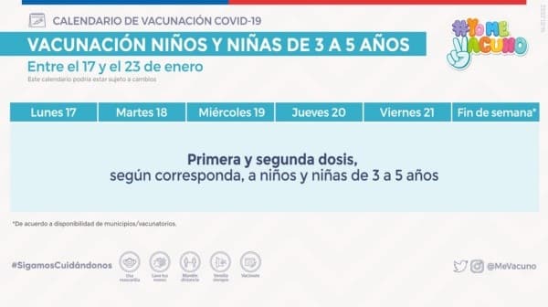 Recordemos queelInstituto de Salud Pública(ISP)autorizó eluso de lavacuna Sinovac en niñas y niños de 3 a 5 añosydesde este lunes 10 de enerocomenzólainoculación con la cuarta dosis(Segundo refuerzo).