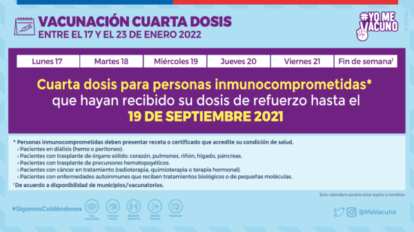 Comenzarán a inocularse las personas inmunocomprometidas,de 12 años o más que recibieron la dosis de refuerzo hasta el 12 de septiembre. Ya desde el7 de febrero comienza la vacunación con cuarta dosis, para personasmayores de 55 añoscon refuerzo al 15 de agosto.