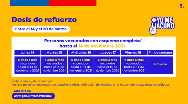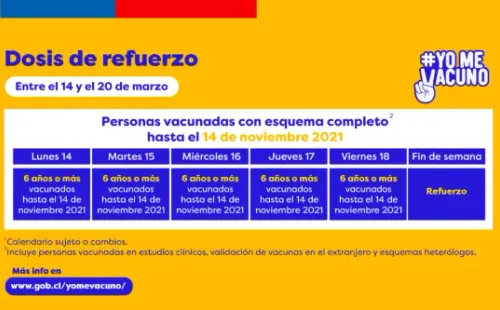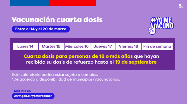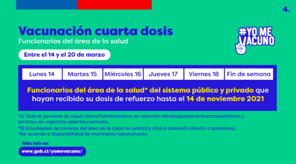 La cuarta dosis contra el Covid-19 sigue en pieesta semana continúa su implementación en mayores de 18 añosque hayan recibido la tercera dosis hasta el 19de septiembre de 2021.Además es el turno delos funcionarios de la saludpertenecientes al sistema público o privado, con dosis de refuerzo hasta el 14de noviembre de 2021.