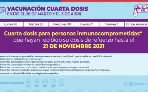 Bajo el mismo contexto,las autoridades sanitarias publicaron las nuevas jornadas de inmunizacióny la próxima semana continúala vacunación de lacuarta dosis en personas desde los 18o másañosque hayan recibido la tercera dosis hasta el 26de septiembre de 2021.