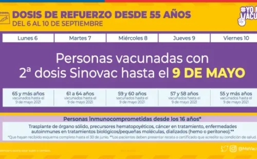 En cuanto a la dosis de refuerzo, se informó que desde el lunes 6 de septiembre al viernes 10 de septiembre, se vacunan las siguientes personas: