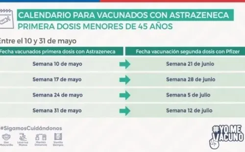 De acuerdo a lo informado por el Minsal, los menores de años que fueron vacunados con la vacuna AstraZeneca deberán recibir la segunda dosis, pero esta inoculación será con la correspondiente al laboratorio Pfizer. Así, en esos casos el tiempo de espera entre dosis y dosis quedará en cinco semanas.