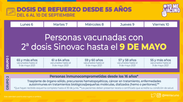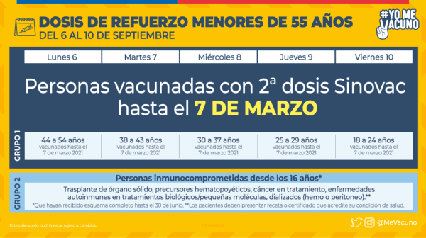 “Ayer miércoles 8 de septiembre se vacunaron 128.932 personas con dosis de refuerzo aplicadas de la vacuna contra SARS-CoV-2, alcanzando un total de 2.128.605. Esto nos llena de orgullo como país y agradecemos el esfuerzo de los profesionales de la Atención Primaria y de los alcaldes y alcaldesas ya que ellos han hecho posible este logro y se han comprometido con este proceso logrando que más de 2 millones 100 mil compatriotas cuenten con su dosis de refuerzo protegiendo así su vida y la de sus familias”, indicó Enrique Paris, ministro de Salud.