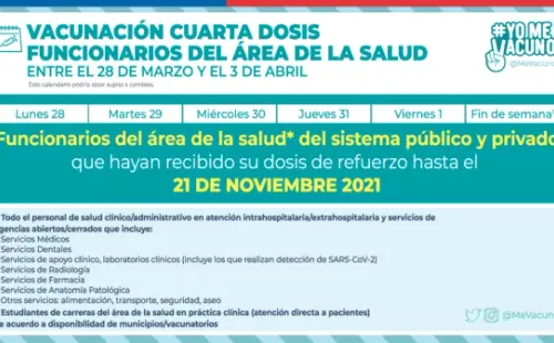Las autoridades sanitarias publicaron lasnuevas jornadas de inmunización,estasemanacontinúalavacunación de lacuarta dosisen personas desde los 18o másañosque hayan recibido la tercera dosis hasta el 26de septiembre de 2021.