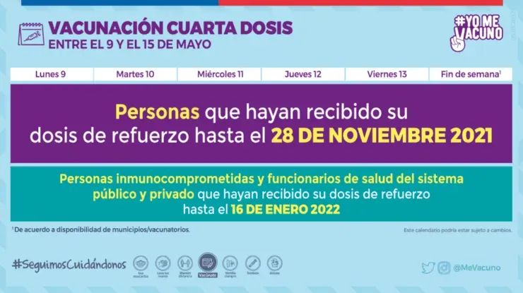 Durante la mañana de este viernes, como es habituallas autoridades sanitarias publicaron lasnuevas jornadas de inmunización, en donde se establece quela próximasemanacontinúalavacunación de lacuarta dosisen personas desde los 18 años o másque hayan recibido latercera dosis hasta el 28de noviembre de 2021.