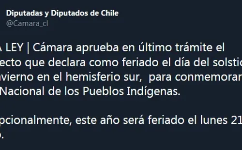 Finalmente será ley. Durante esta tarde la Cámara de Diputadas y Diputados despachó el proyecto de que establece el feriado correspondiente al Día Nacional de los Pueblos Indígenas.