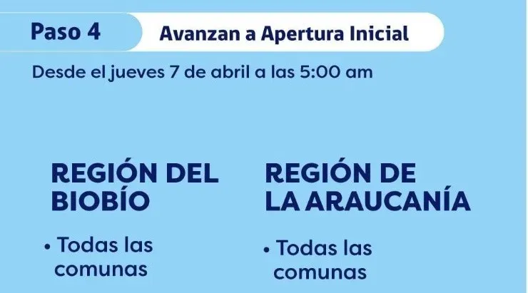 – Avanzan a Fase 4 de Apertura Inicial: Región del Biobío (todas las comunas), Región de la Araucanía (todas las comunas).