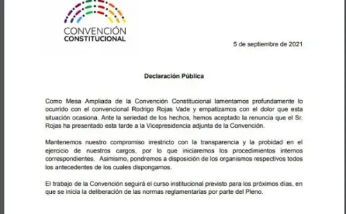 “Como Mesa Ampliada de la Convención Constitucional lamentamos profundamente lo ocurrido con el convencional Rodrigo Rojas Vade y empatizamos con el dolor que esta situación ocasiona”, indicó la directiva a través de un comunicado.