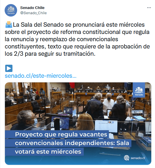 “Atendiendo a lo que informó el Senado, que se encontraría en tabla para el día miércoles el proyecto de ley que permite que las y los convencionales constituyentes puedan renunciar de forma voluntaria y ser reemplazados, es que mantendré en espera de retomar mis funciones, confiando en que las fuerzas políticas aprobarán el proyecto de ley que permitirá que el distrito 13 vuelva a estar representado con cuatro escaños”, sostuvo.