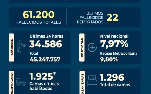 Se registraunapositividad de un 7,97% a nivel paísy de un 9,80% en laRegión Metropolitana, lamentando elfallecimiento de 22personareportadas a causa del virus.Destacando queloscasos activos son 15.242al día de hoy.