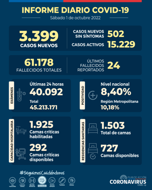Se emitióun nuevoinformesobre laactualidad de lapandemiaen Chile,publicado este 1 de octubre por parte delMinisterio de Saludqueinformó una baja en loscasos deCovid,con 863menosque el sábadoanteriorregistrando una disminuciónde contagios.