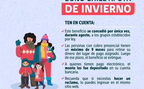 El Bono Invierno es parte de Chile Apoya y se implementó este año durante la misma época para costear los gastos de la temporada, como una ayuda ecónomica para calefacción, alimentos, entre otros.