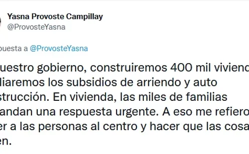 “En nuestro gobierno, construiremos 400 mil viviendas y ampliaremos los subsidios de arriendo y auto construcción. En vivienda, las miles de familias demandan una respuesta urgente. A eso me refiero con poner a las personas al centro”, concluyó la candidata.
