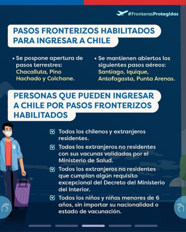 La apertura de las fronteras terrestres de Chacalluta, Colchane y Pino Hachado se pospuso sin fecha definitiva.