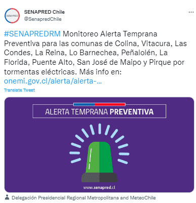 De acuerdo a lo indicado por elServicio Nacional de Prevención y Respuesta ante Desastres(Senapred) se espera quehasta la noche de estemartes 10 de enero se desarrollentormentas eléctricas en las siguientes comunas de la Región Metropolitana: