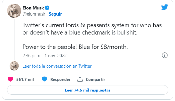 “El actual sistema señores y campesinos de Twitter: para saber quién tiene o no una marca de verificación azul es una mierda. ¡Poder para el pueblo! Azul por $8/mes”, escribió Elon Musk en su cuenta de Twitter.