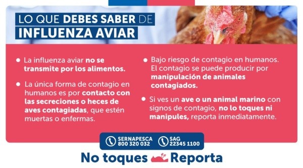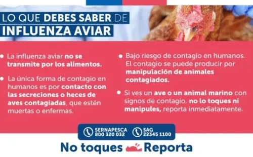 Por lo mismo, el Minsal hizo “un llamado a la ciudadanía a no manipular aves o mamíferos enfermos o muertos e insta a los trabajadores avícolas a seguir los protocolos de seguridad correspondientes y a vacunarse contra la influenza estacional”.