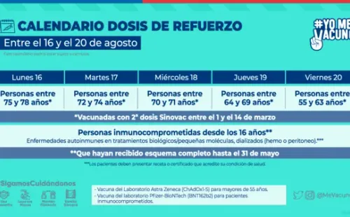 Para la semana del16 al 20 de agosto está contemplada la vacunación de tercera dosis para personas desde los 55 a los 78 años.Es importante recordar que todas las personas deben haber recibido su seguda dosis entre el 1 y 14 de marzo. En caso contario, deben esperar el avance delcalendario.