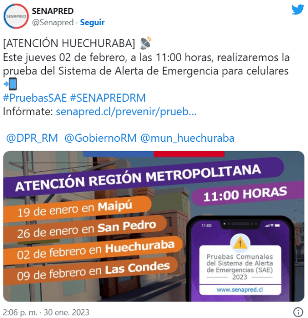 Cabe agregar que el Servicio Nacional de Prevención y Respuesta ante Desastres (Senapred) informóque, “dado que el mensaje se envía a un polígono definido en base a la ubicación de las antenas de telefonía móvil,esmuy probable que también lo reciban las personas ubicadas en laszonas aledañasa las comunasen donde se realicen las pruebas“.