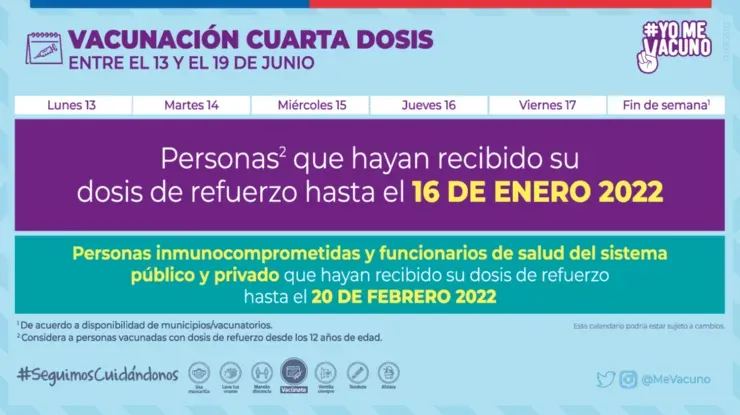 Las autoridades sanitarias anunciaron lasnuevasjornadas de inmunización,en donde se establece queestasemanacontinúalavacunación de lacuarta dosispara quienes hayan recibido latercera dosishasta el 16de enero de 2022.