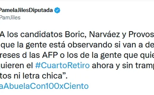 “La gente está observando si van a defender los intereses d las AFP o los de la gente que quiere SU plata, quieren el #CuartoRetiro ahora y sin trampas, sin impuestos ni letra chica”, señaló la autodenomianda ‘Abuela’.
