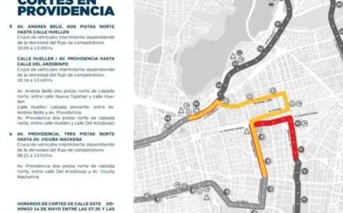 A raíz de la Maratón de Santiago 2023 este domingo 14 de mayo, se realizarán diferentes cortes y desvíos de tránsito, los que partirán a las 05:00 horas y se extenderán hasta las 14:30 horas. Revisa todos los detalles a continuación.