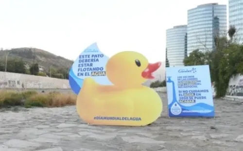 Por ello instalaron un pato gigante de 4 metros de alto y de ancho a las orillas del río. La iniciativa liderada por la Municipalidad de Las Condes pretende llamar la atención de las personas sobre el consumo de agua en medio de la crisis hídrica que azota al país.