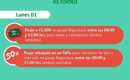 “Peaje a Luca” para vehículos livianos en peaje Angostura, en ambos sentidos, entre las 08:00 y 12:00 horas.
