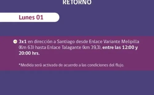 3×1 en dirección a Santiago entre Variante Melipilla (km 63) y Talagante (km 39,3), entre las 12:00 y 20:00 horas.