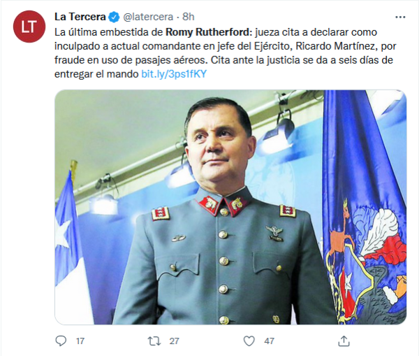 La ministra en visita, Romy Rutherford, citó a declarar en calidad de inculpado a la autoridad castrense por fraude en el Ejército, a solo ocho días de terminar su periodo.