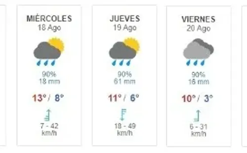 Las lluvias estarían llegando a Santiago el 18 y 19 de agosto, aunque algunos prevén precipitaciones para cuatro díasde la semana.Según Meteored,el martesde la próxima semana se estaría librano de las lluvias, pero de todas formas experimentaría bajas temperaturas. Mientras que el fin de semana volvería el calor.Revisa el pronóstico a continuación: