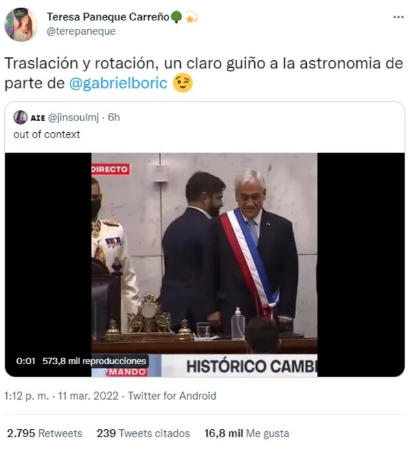 Incluso, la científica Teresa Paneque comentó el jocoso hecho en suTwitter (@terepaneque): “Traslación y rotación, un claro guiño a la astronomía de parte de @gabrielboric”.