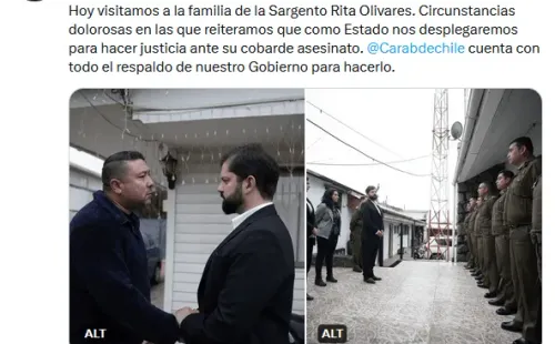 Asimismo, el jefe de Estado reiteró el respaldo del Gobierno a la institución policial. “Nuestros carabineros y carabineras tienen todo el respaldo, concreto, con recursos, con herramientas de nuestro Gobierno, del Estado y de todos los chilenas y chilenas. Por lo tanto, cuando se encuentren con ellos Carabineros se va a defender”.