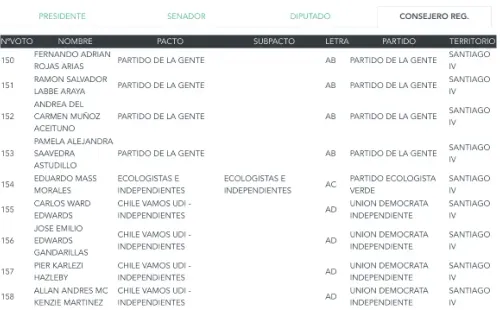 Al hacer clic en Consejero Regional, se mostrará el número de voto, el nombre del candidato, el pacto, el subpacto, el partido al que pertenece y el territorio.