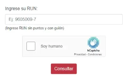 Una vez dentro de la web, debes escribir tu RUT, sin puntos y con guion. Luego, debes hacer clic en el captcha “Soy humano” y en “Consultar”.