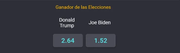 Coolbet te cuenta quela victoria de Trump con una cuota de 2.64, es decir casi tres veces. Mientras su rival directo el demócrata Joe Biden cancela 1.52, menos del doble.