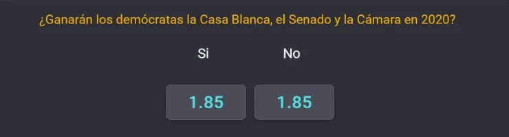 Y si nos vamos a los resultados por estados, como también en la lucha de demócratas y republicanos por el Senado y la Cámara de Representantes, el OSO de Coolbet paga1.85 si es que el partido Demócrata se lleva la victoria presidencial y, de paso, en el Congreso.
