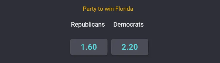 Al mismo tiempo, también puedes pronosticar quién se llevará uno de los denominadosswing states o estados bisagra para estas elecciones en Estados Unidos. Si vas por el triunfo republicano en Florida, uno de los estados clave, paga 1.60 sobre los 2.20 si piensas que los demócratas vencerán.