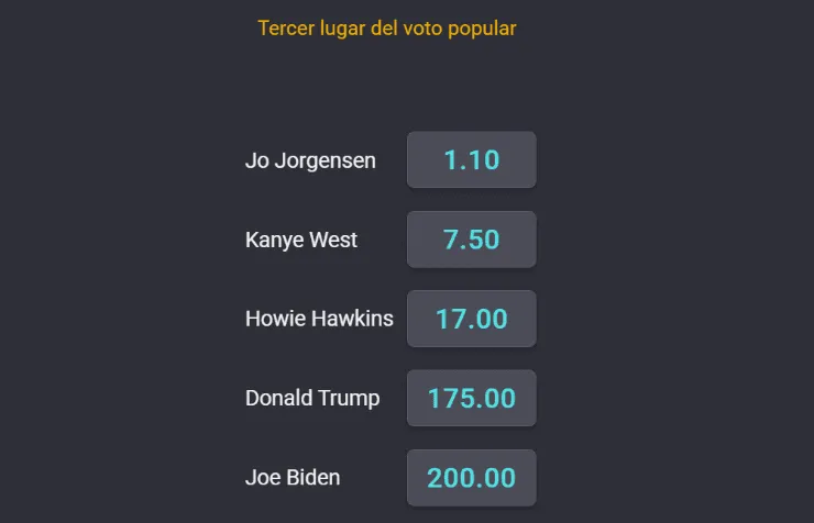 Pero además, Coolbet también se la juega por quién ganará, por ejemplo, en el Voto Popular y del Colegio Electoral. Es más,el rapero afroamericano Kanye West paga 7.50 veces si termina tercero en las votaciones populares este martes en el recuento definitivo.
