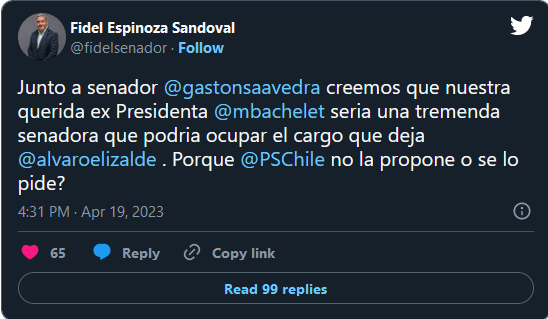 “Junto al senador Saavedra creemos que nuestra querida expresidenta Michelle Bachelet sería una tremenda senadora que podría ocupar el cargo que deja Álvaro Elizalde. ¿Por qué el PS no la propone o se lo pide?”, comentó Espinoza.