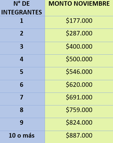 Los montos de entrega van desde los 177 mil pesos,aumentando según la cantidad de personasque pertenezcan al mismo grupo familiar en el RSH,hasta llegar a los887 mil para familias de 10 personas o más.