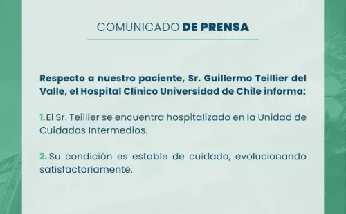 Por medio de un comunicado de prensa, el hospital universitario señala: “El Sr. Teillier se encuentra hospitalizado en la Unidad de Cuidados Intermedios”, aunque no precisaron cuáles son los motivos del porqué el líder político se encuentra hospitalizado en el recinto universitario.